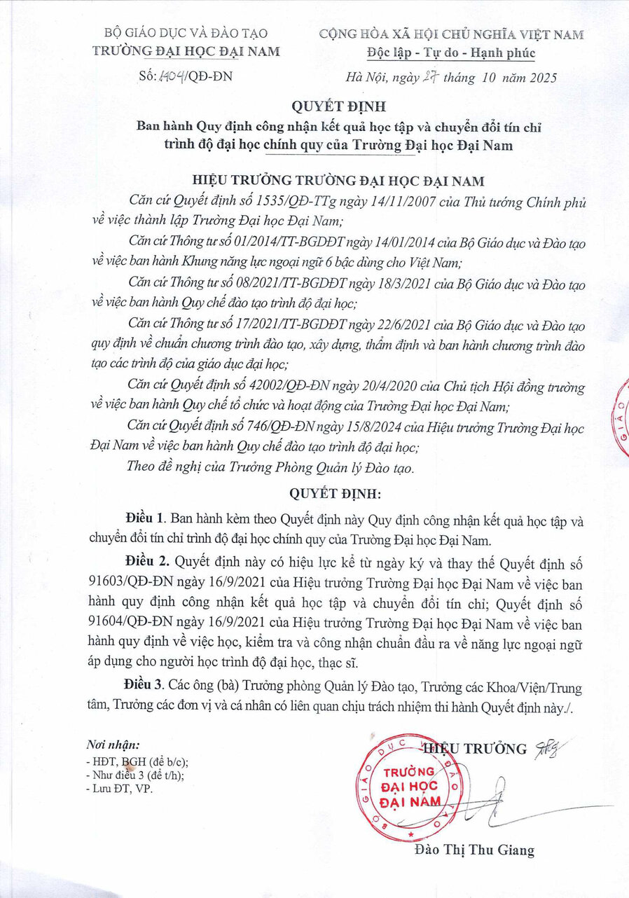 Decision No. 1404/QD-DN on promulgating the Regulations on recognition of learning outcomes and credit conversion of regular university degrees of Dai Nam University.