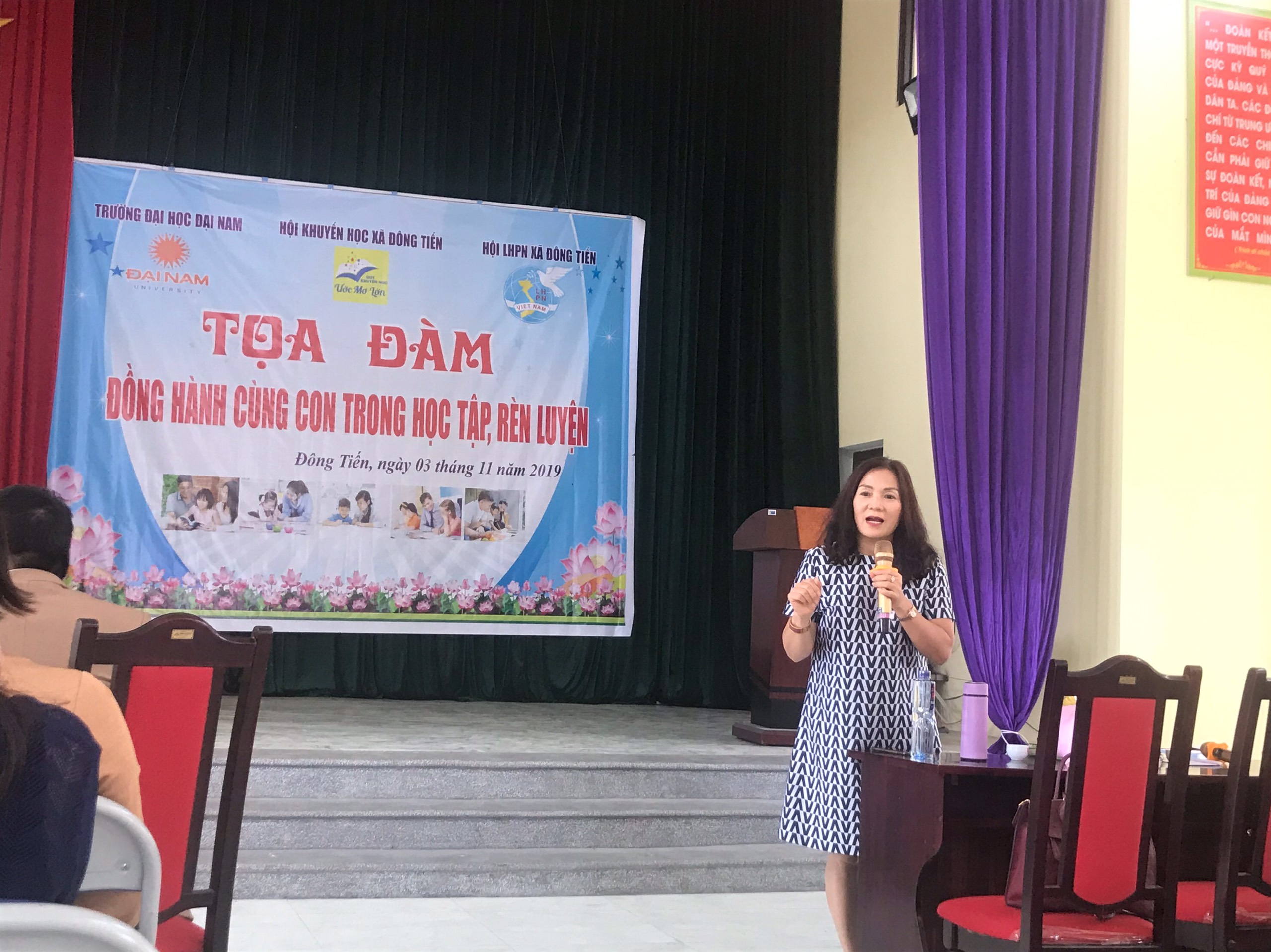 Tham dự buổi Tọa đàm, về phía Trường ĐH Đại Nam có sự hiện diện của cô Cao Thị Hòa – Phó Hiệu trưởng; về phía khách mời, có các diễn giả nổi tiếng đến từ Học viện Thành công về chia sẻ bí quyết nuôi dạy và đồng hành cùng con trong học tâp, rèn luyện; về phía xã Đông Tiến có đại diện UBND, Hội khuyến học “Ước mơ lớn” và hàng trăm phụ huynh trong xã.