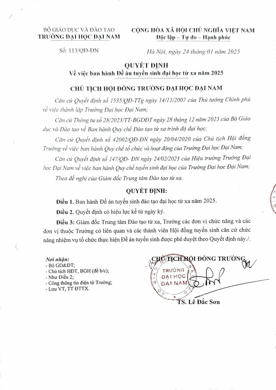 Xem Quyết định về việc ban hành Đề án tuyển sinh đại học từ xa năm 2025 của Trường Đại học Đại Nam TẠI ĐÂY.