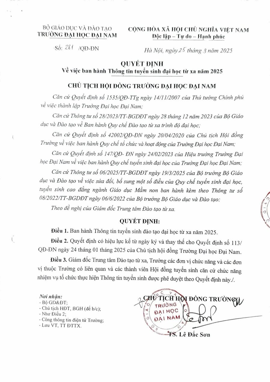 Xem Quyết định về việc ban hành Thông tin tuyển sinh đại học từ xa năm 2025 của Trường Đại học Đại Nam TẠI ĐÂY.