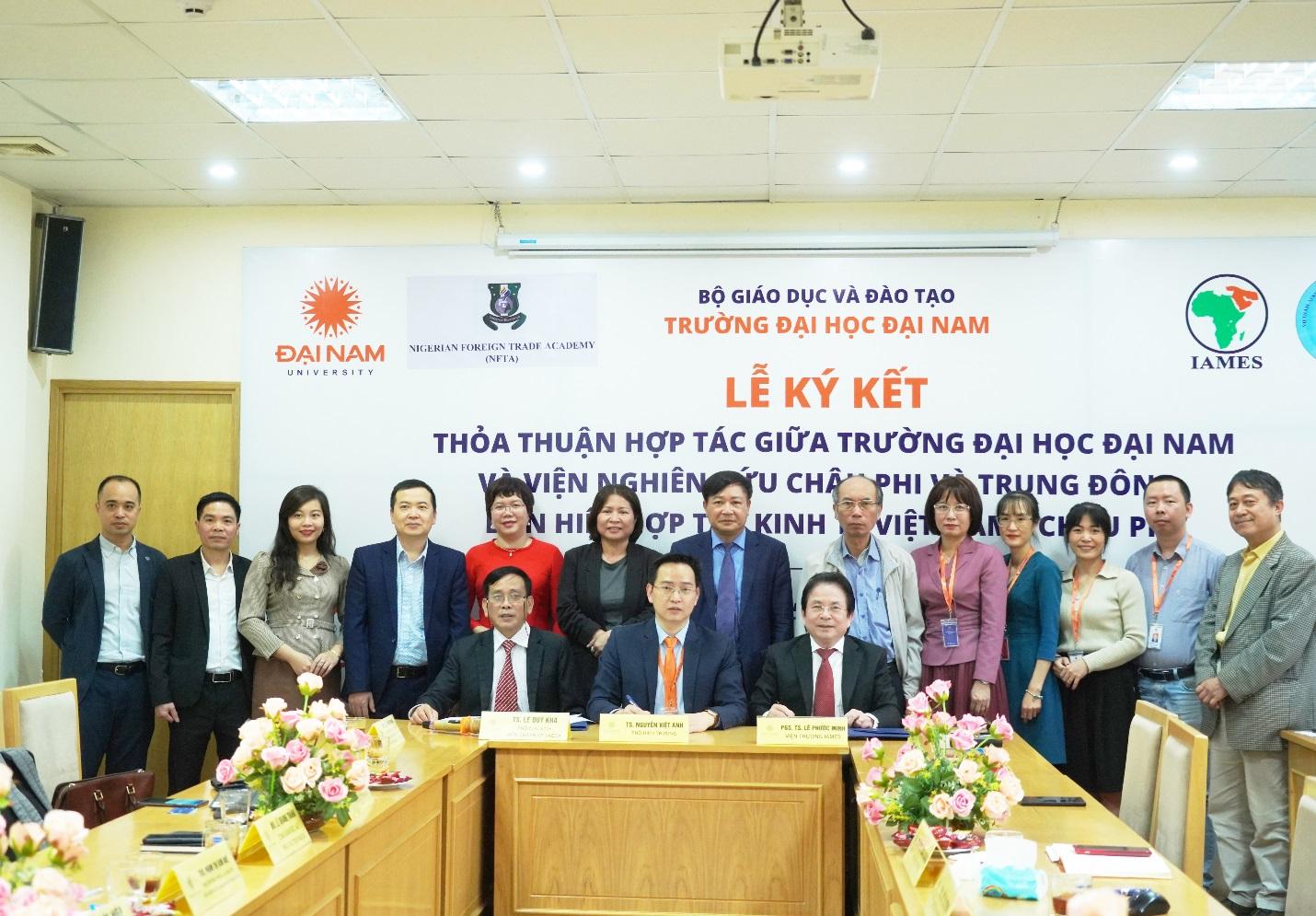 Tiếp nối các hoạt động liên kết đào tạo trước đó, vừa qua, trường Đại học Đại Nam đã ký kết thỏa thuận hợp tác (MoU) trực tiếp với Viện Nghiên cứu Châu Phi và Trung Đông (IAMES), Liên hiệp Hợp tác Kinh tế Việt Nam - Châu Phi (VAECA); ký kết thỏa thuận hợp tác (MoA) trực tuyến với IAMES, VAECA, Phòng Thương mại Công nghiệp Nigeria - Việt Nam (NVCCI) và Học viện Ngoại thương của Nigeria (NFTA) nhằm xây dựng hệ sinh thái đào tạo thực chiến, hiện đại, đa dạng, linh hoạt, giàu kết nối.
